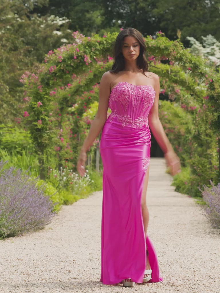 Faviana Style 11209 is absolutely everything! This dress has it all - a satin corset top with exposed boning and beautiful beaded appliqués for a touch of glamour. With a curve hem leg slit, it's the hottest dress of the season. Get ready to be the center of attention!