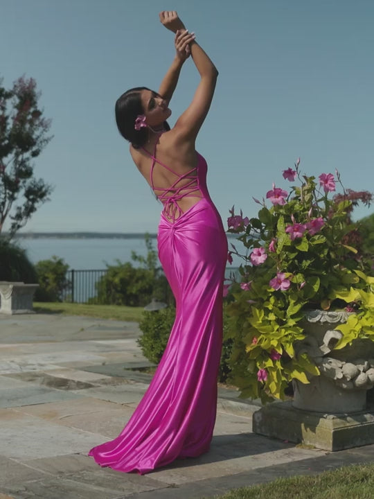 This dress is all about the back! Faviana ES10890 is a beautiful stretch satin gown with an elegant, clean silhouette from the front, and a strappy lace up back and knot detail on the lower back for a gorgeous and elongated look. We want one in every color!