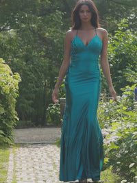 Slip into elegance with this satin V-neck dress, designed to make you feel your best with its shimmering fabric and playful lace appliqué. The intricate lace trims the front, sides, and cascades down the back of the flowing skirt, adding a touch of romance to every step. Perfect for dancing the night away or making a grand entrance, this long dress combines comfort with a flirty flair.