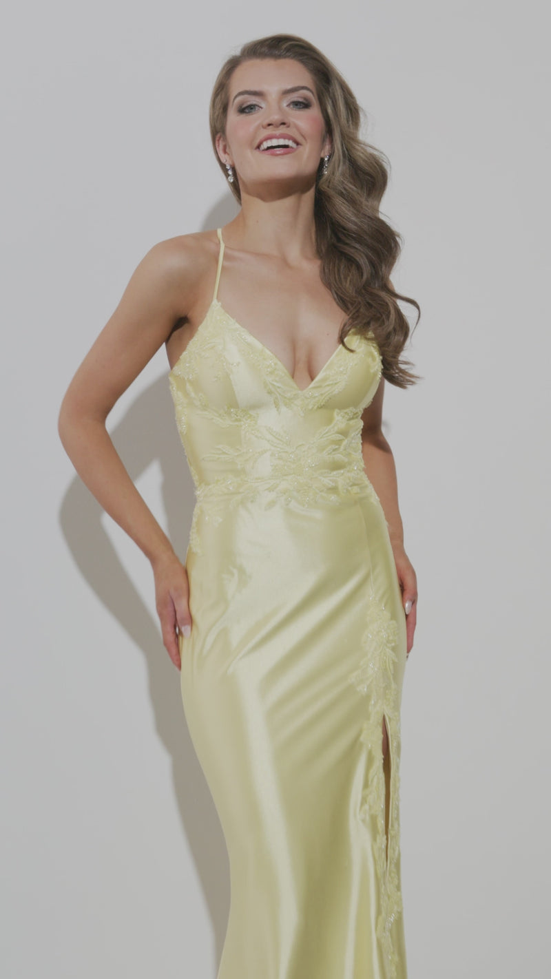 Look your absolute best in this sleek satin V-neck prom dress! Its beaded bustier and leg slit will have you feeling like you just stepped off the runway. And its lace-up back adds a touch of sass and drama that will have all eyes on you!