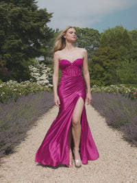 This strapless corset dress is your go-to for effortless charm. Featuring a delicate lace bustier with a flirty sweetheart neckline and a satin skirt detailed with pleating and a leg slit, it’s designed to make you feel confident and ready to celebrate. Perfect for walking into the night with style!